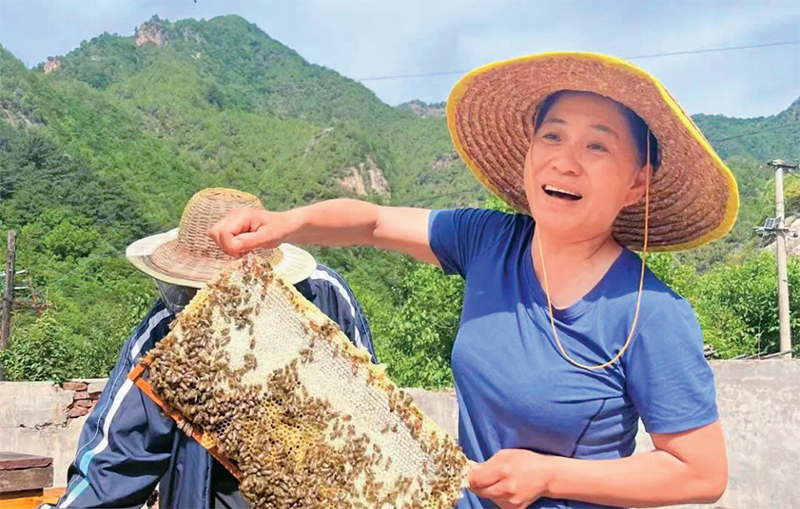 党员、干部锤炼坚强党性,就要始终把人民放在心中最高位置,为人民利益不懈奋斗。2025年7月23日至29日,北京市遭遇极端强降雨,怀柔区琉璃庙镇孙胡沟村党支部书记、村委会主任尹春燕沉着组织群众紧急避险,将村民转移到安全区域,自己和丈夫却被洪水冲走,不幸牺牲。图为2024年7月,尹春燕带领村民摇蜂蜜。 北京市怀柔区委宣传部供图